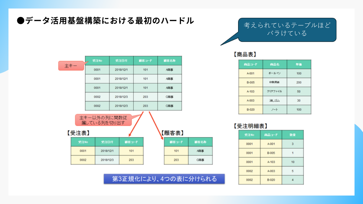 小俣 当初は、スクラッチ開発したSFAに登録されたデータの可視化を目指しました。SFA構築時に入力項目(メーカーや企業のランクなど)をマスタ化したり、日本語表記の項目をいつでも変更できるようにパラメーターとして数字で管理したりと、正規化を意識してデータベースを設計したんです。しかし、この努力が裏目に出てしまった。データを単純にBIツールに取り込み表示すると、ダッシュボードで「1」「2」と表示されてしまったり、個人名はあるが所属はわからないなど、ユーザーはその数字が何を意味するのかわからなかったり、検索しづらいという事象が起こってしまったんです。