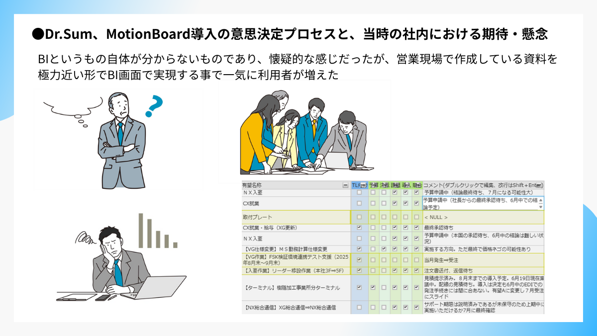 そこで我々がやったことは、営業現場と徹底的に話すことです。「どのようなものができれば、営業の仕事は楽になりますか?」「手集計の苦労がなくなり、自動集計されたボードがあれば助かりますよね」「営業活動に役立つもの、必要とされるものをつくりたい」と真摯に訴えかけ、意見を聞きました。