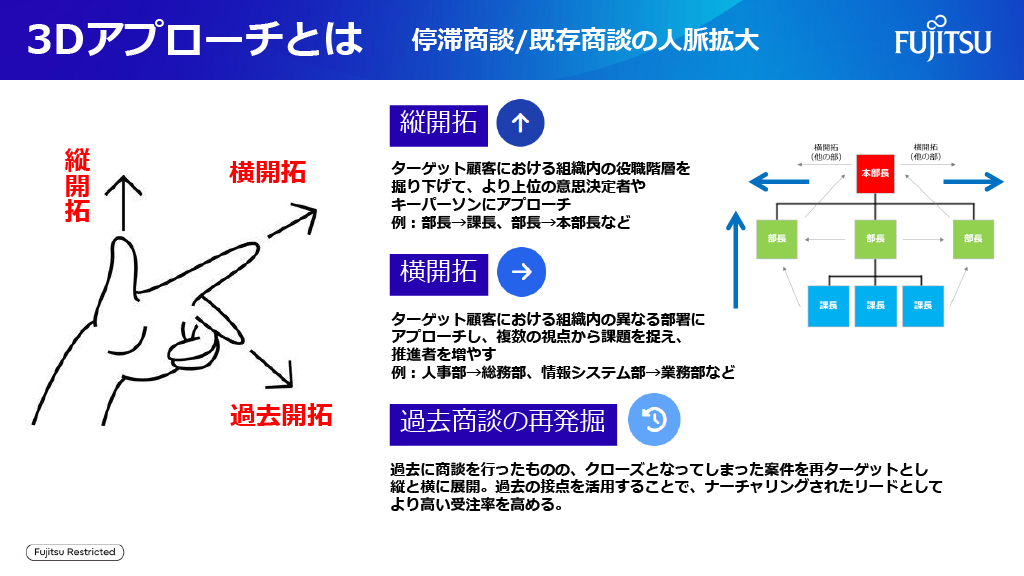 ──今回の挑戦では、顧客を多角的に開拓していく「3Dアプローチ」がひとつの鍵となりますね。改めて、その目的と具体的な事例を教えていただけますか?