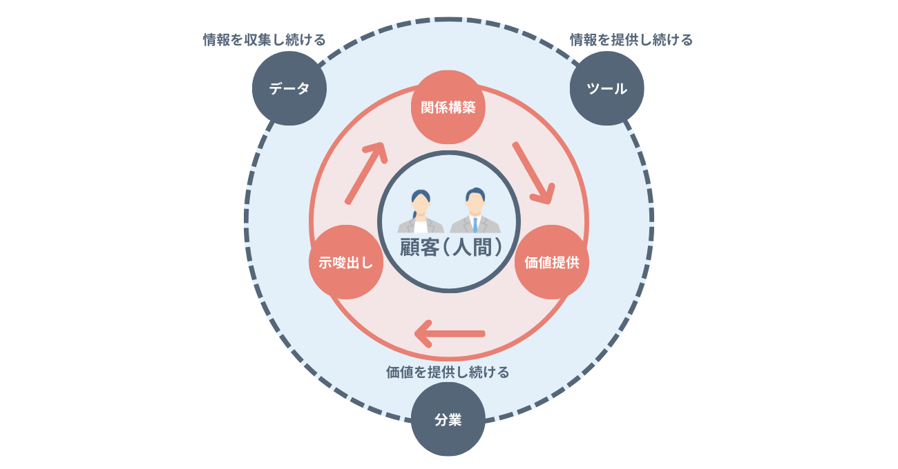 顧客にもっとも近い内円は、実際に顧客と接する領域であり、顧客体験の“本体”となる部分だ。ここでは「関係構築」「価値提供」「示唆出し」の3つの働きかけが、相互に絡み合いながら顧客体験全体を豊かにしていく。この連続的なアプローチこそが、カスタマーモデルの根幹を支えるのだ。