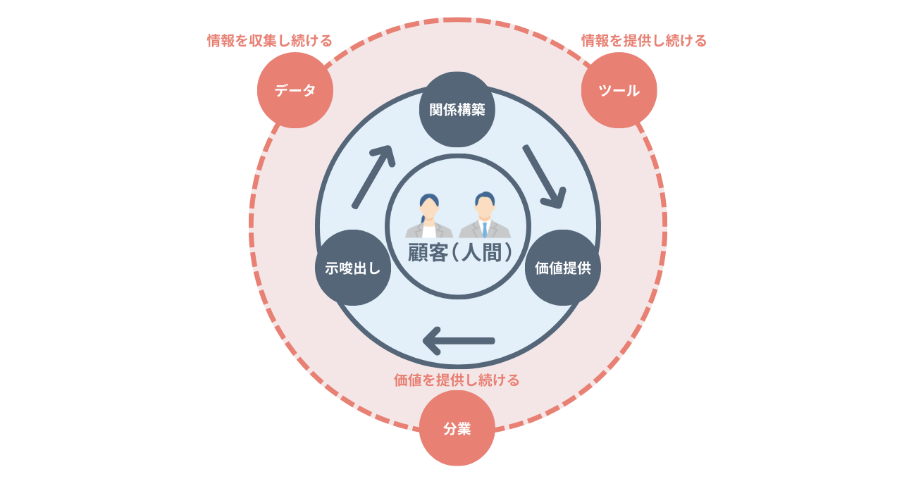 このように、カスタマーモデルは「人による顧客との対話」と「それを支える仕組み」が一体となって機能する構造を持つ。中心にあるのは常に“顧客”であり、その意思決定に合わせてアプローチの内容・順序・手段を柔軟に設計していく。