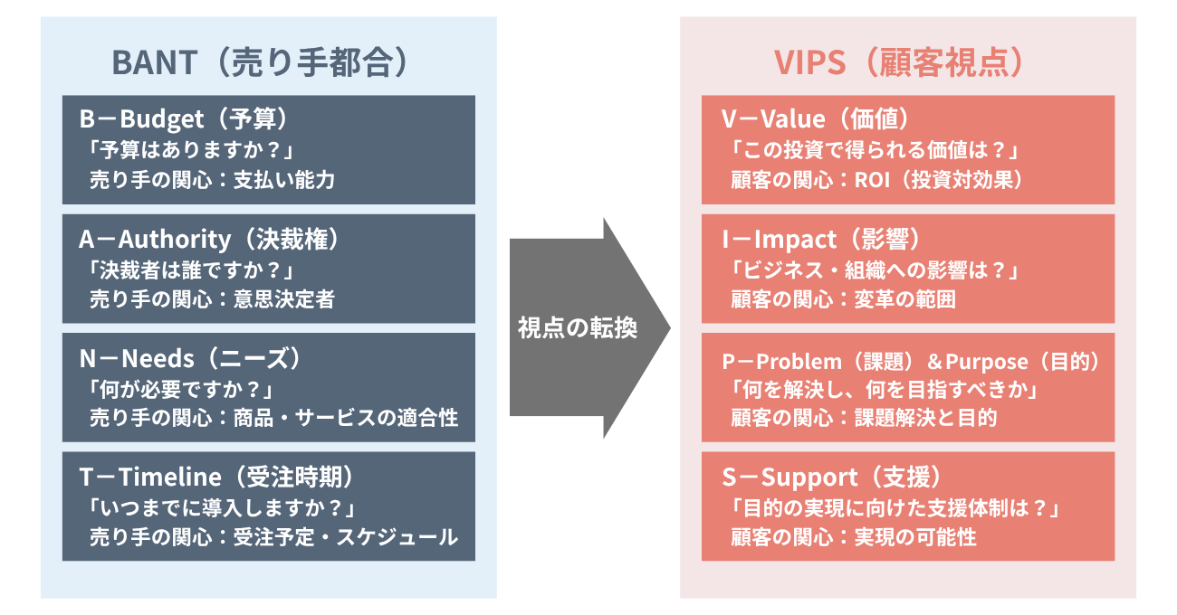 VIPSは、売り手視点で案件の“見込み度”を判断するBANTとは異なり、顧客の意思決定の背景にある価値観や組織内の事情、進め方の論理を丁寧に読み解き、「どうすればこの顧客が安心して意思決定できるか」を考えるための視点である。