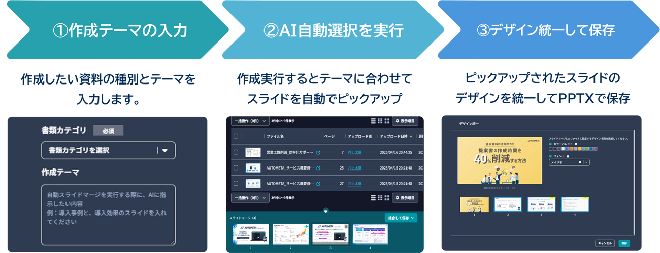 これらの課題を受け、AUTOMETAでは、資料を1から作るのではなく、使える資料を組み合わせて活用するという実務的アプローチに着目し、蓄積された既存資料をもとに、AIが構成設計から資料作成までを担うAIスライドマージの開発に至った。