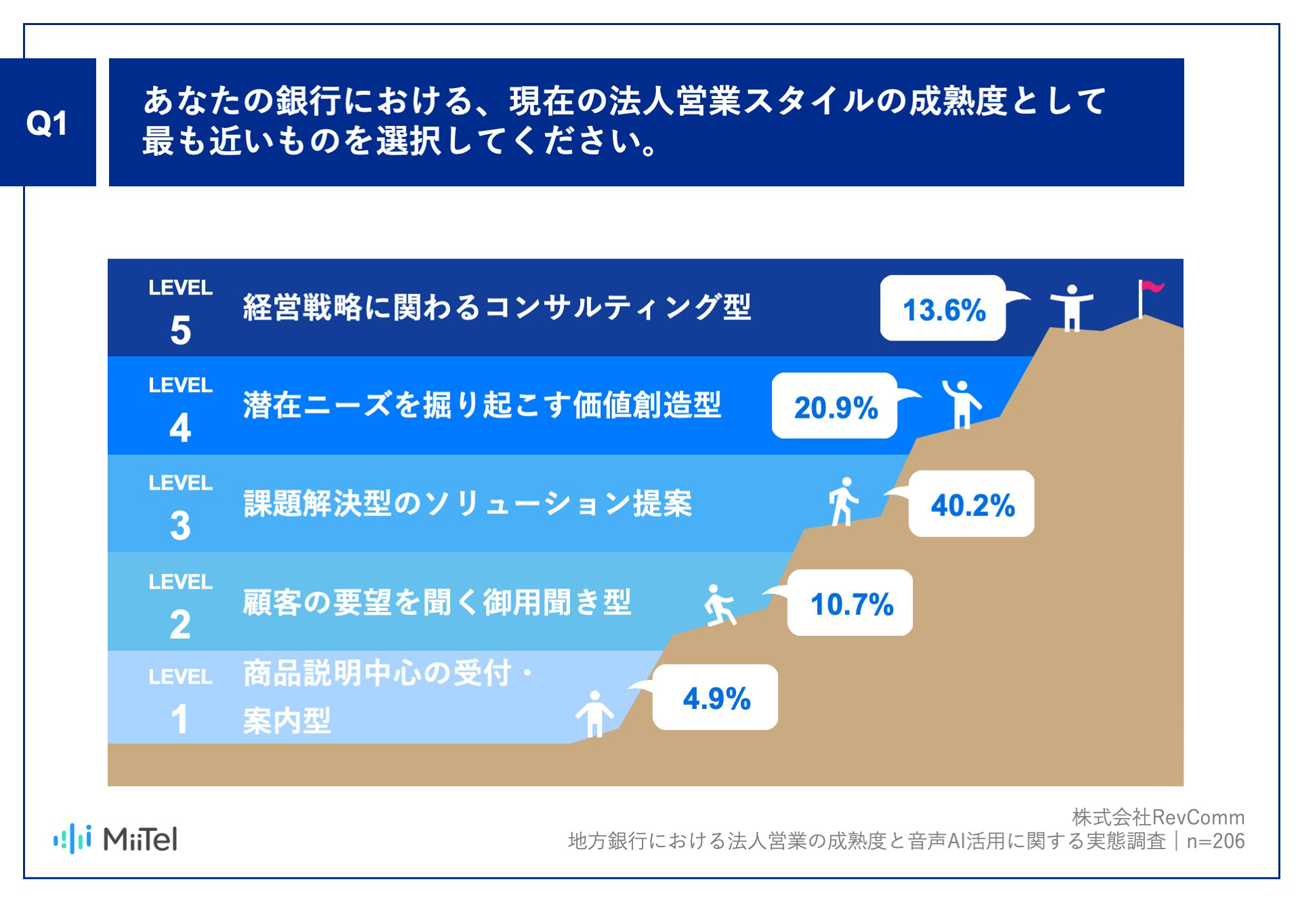 音声解析AI「MiiTel(ミーテル)」を提供しているRevComm(読み:レブコム)は、地方銀行の法人営業部門の担当者206名を対象に、地方銀行における法人営業の成熟度と音声AI活用に関する実態調査を実施した。