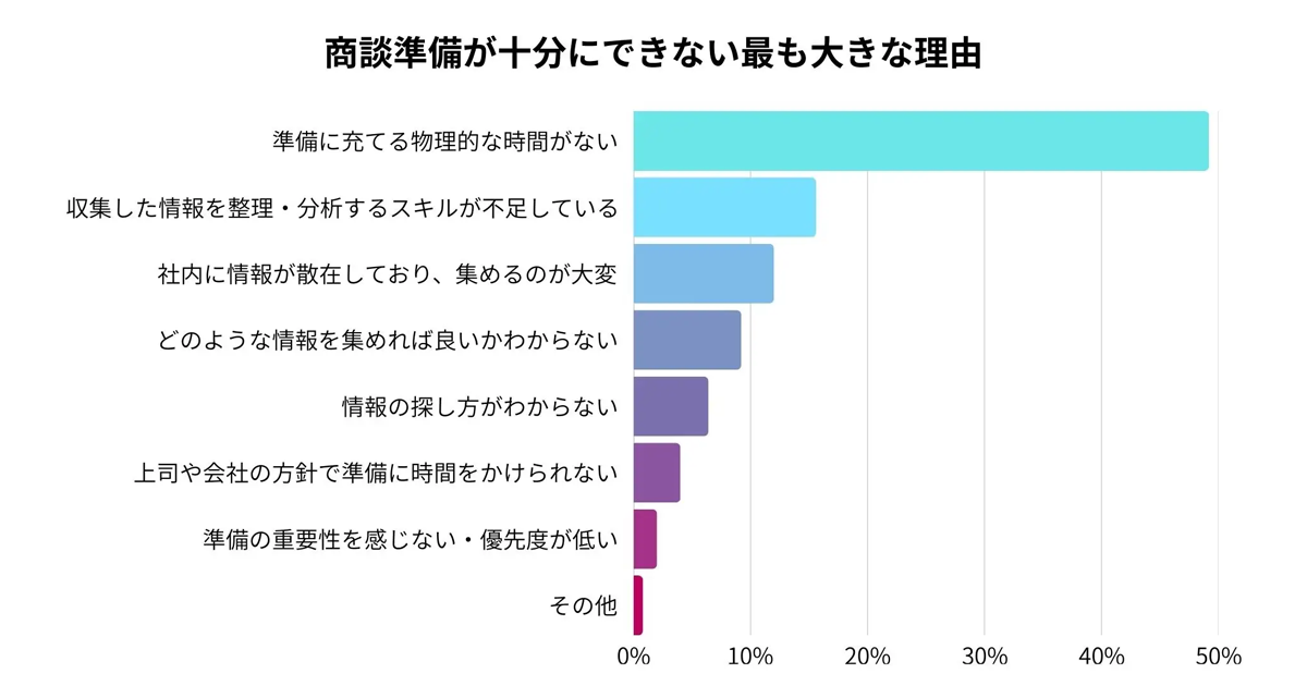 商談準備が十分にできているか質問したところ、過半数(55.1%)が何らかの準備不足を感じていることがわかった。その最大の理由として、約半数(49.2%)が「準備に充てる物理的な時間がない」を挙げており、構造的な時間不足が質の高い準備を阻害していることがわかった。