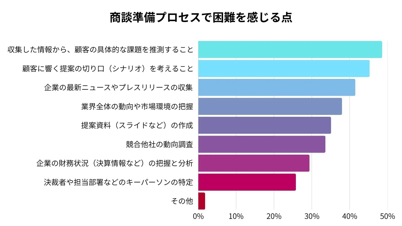 準備プロセスでとくに困難を感じる点を質問すると、「顧客の具体的な課題を推測すること(48.6%)」「顧客に響く提案の切り口(シナリオ)を考えること(45.3%)」という、深い思考を要する工程が上位を占めた。情報収集だけでなく、そこから価値ある提案を創出するプロセスに負荷がかかっていることがわかった。