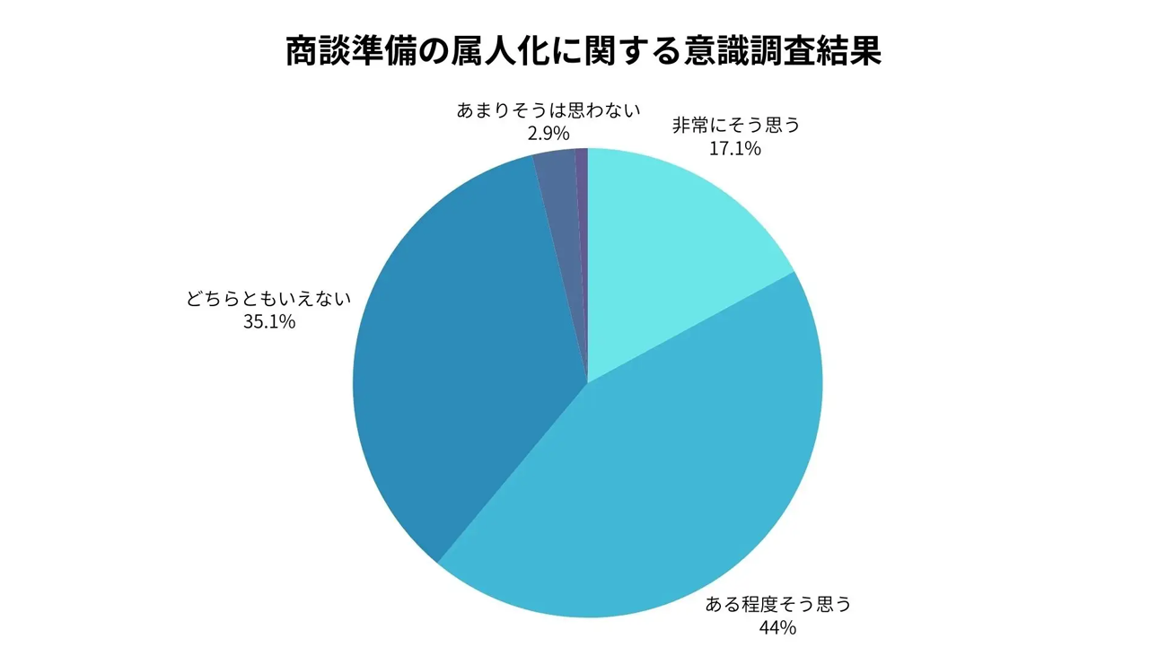 所属する営業組織において、商談準備の方法や質が個人のスキルや経験に依存している(属人化している)と感じるか質問したところ、「非常にそう思う」「ある程度そう思う」を合わせて61.1%が回答した。これは、過半数の営業組織で、準備の質が個々の能力に委ねられており、組織として標準化・効率化が図れていないという実態を示している。