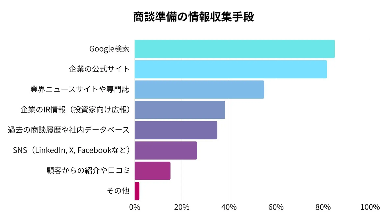 商談準備の情報収集手段としては「Google検索(85.0%)」「企業の公式サイト(81.7%)」が多く、手軽な方法に依存している傾向が見られる。一方で、より深い分析につながる「企業のIR情報(38.4%)」や「社内データベース(35.1%)」の活用率は相対的に低い結果となった。