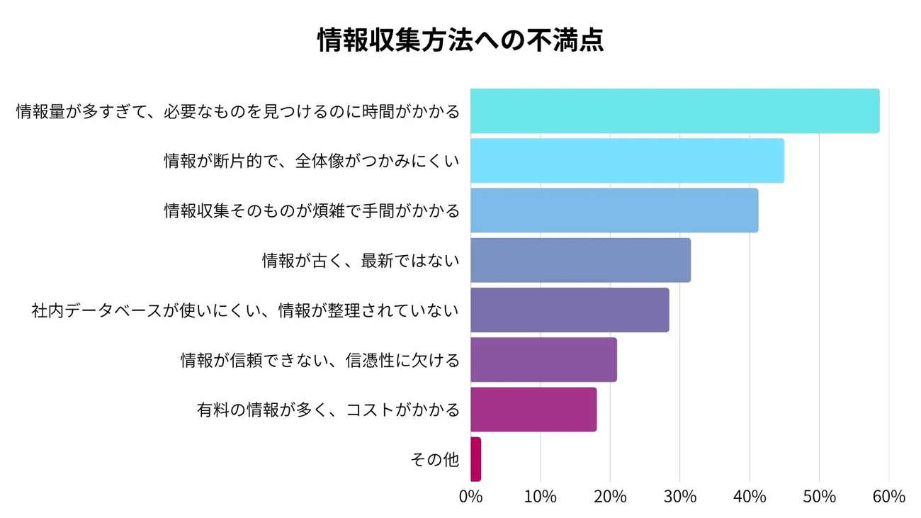 現在の情報収集方法への不満点では、「情報量が多すぎて、必要なものを見つけるのに時間がかかる(58.7%)」がトップだった。次いで、「情報が断片的で、全体像がつかみにくい(45.0%)」「情報収集そのものが煩雑で手間がかかる(41.3%)」が続き、さまざまな情報の中で本質的な情報を見つけ出すことに営業が苦労していることがわかった。