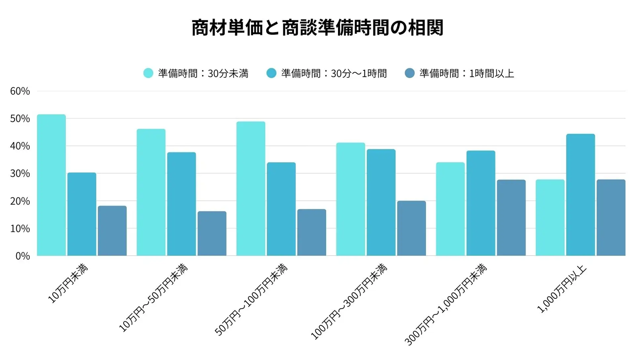 取り扱い商材の単価別に商談準備時間を見ても、単価が上がるほど準備時間も増えるという単純な相関は見られない。「1,000万円以上」の高額商材を扱う層も、27.8%が準備時間「30分未満」と回答しており、時間不足が単価に関わらず営業組織全体の課題であることを示唆している。