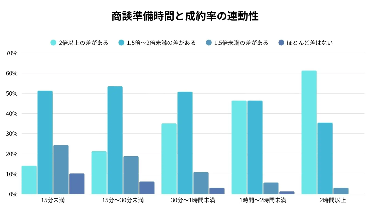 商談準備時間と「準備の有無による成約率の差」の実感を詳細にクロス集計したところ、準備時間が長くなるほど、成約率への好影響を実感する傾向が見られた。とくに準備に「2時間以上」をかける層では61.3%が「2倍以上の差がある」と回答しており、これは準備時間「15分未満」の層の4.3倍以上の数値になる。