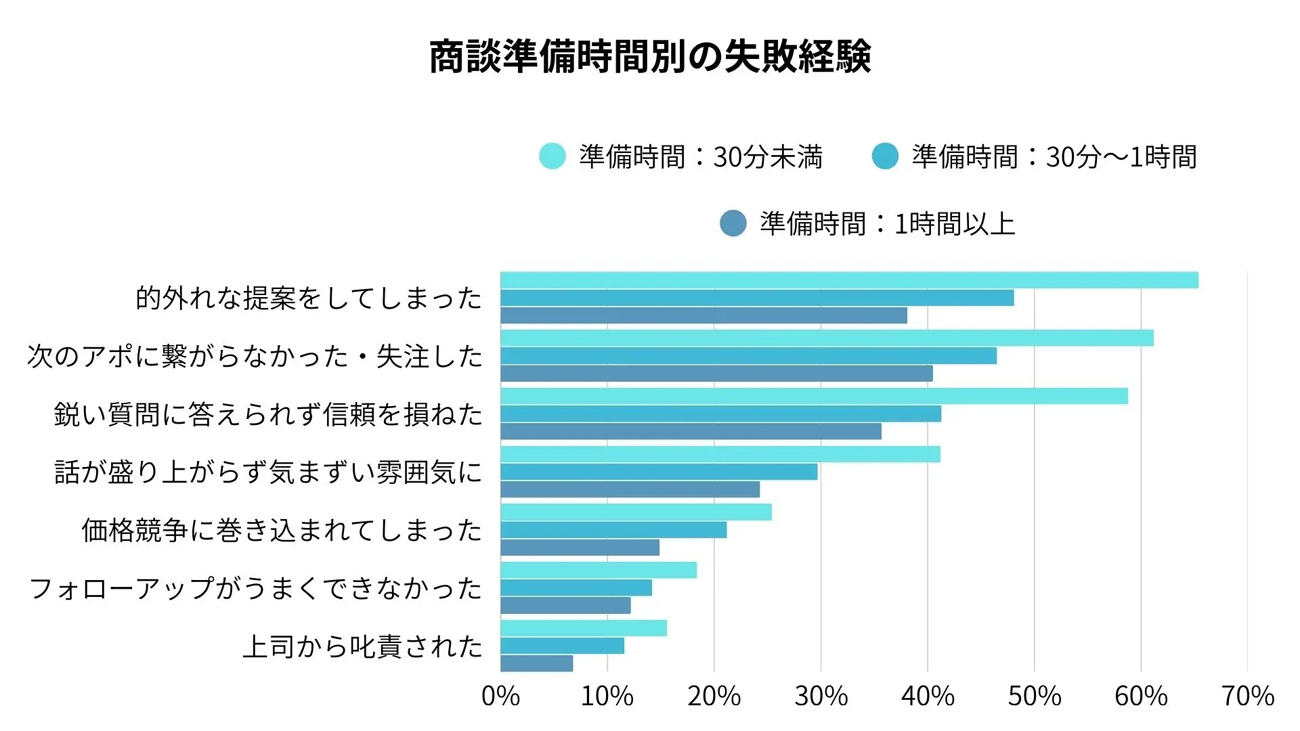 準備時間が短いほど、さまざまな失敗を経験する割合が高くなることがわかった。とくに準備時間「30分未満」の層は、65.4%が「的外れな提案」、61.2%が「失注」、58.8%が「信頼毀損」という失敗を経験している。準備不足が多岐にわたる機会損失に直結していることが明らかになった。