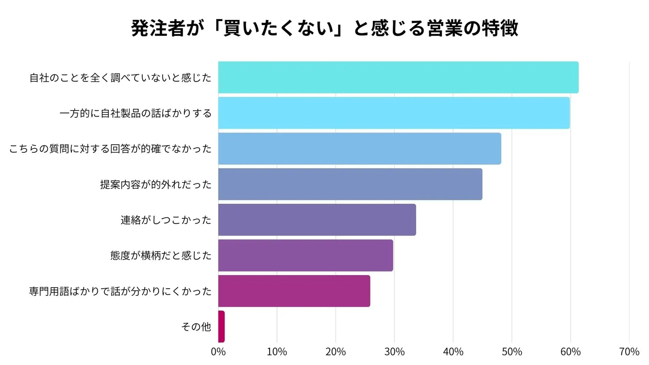 「買いたい」営業の特徴は、「自社や業界への理解が深かった(68.3%)」がトップだった。一方で「買いたくない」営業は「自社のことを全く調べていないと感じた(61.4%)」がトップとなり、事前準備に基づく顧客理解が評価を二分していることが明らかになった。