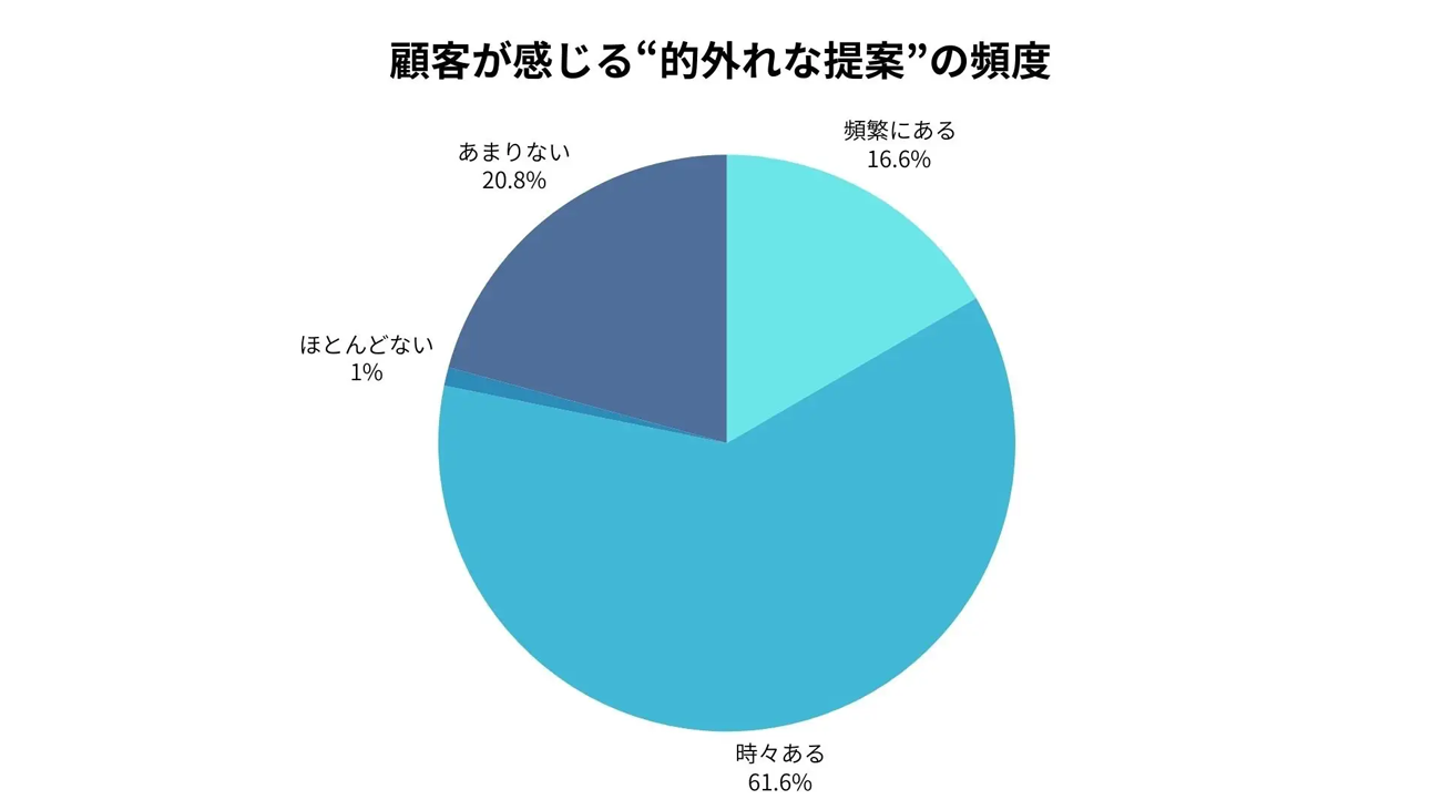 初回の商談で、営業担当者から的はずれだと感じる提案や、自社の状況を理解していないと感じる説明を受けた経験があるか質問したところ、「頻繁にある」「時々ある」を合わせて78.2%に達した。さまざまな発注担当者が、準備不足の営業による「残念な商談」を日常的に経験している実態が明らかになった。