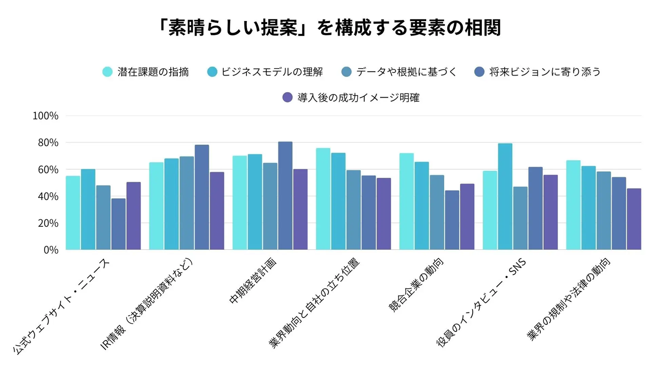 「この営業はよく調べている」と感じさせる情報(縦軸)と、発注者が「素晴らしい」と感じる提案の要素(横軸)の相関から、特定の情報収集が特定の価値提供につながりやすいことが示唆される。たとえば、「IR情報」や「中期経営計画」を読み込んでいる営業は、「将来ビジョンに寄り添う」という付加価値を提供できる可能性が高い。