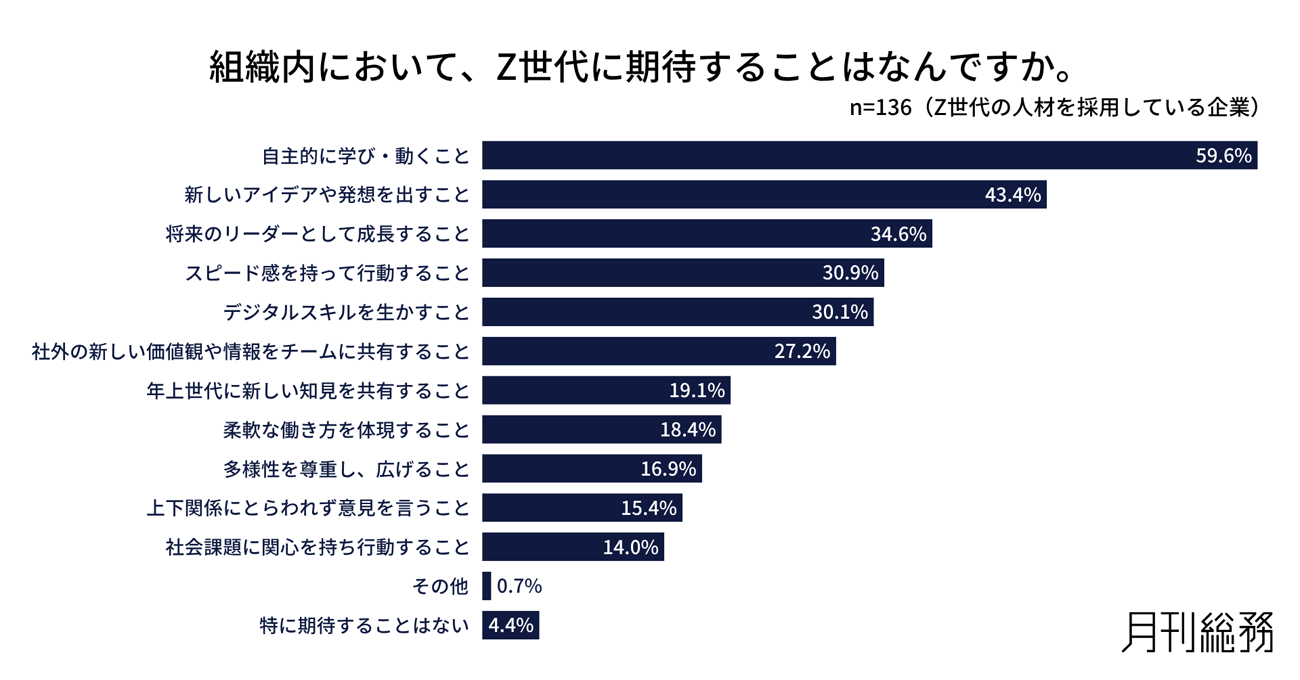 Z世代に期待することは「自主的に学び・動くこと」「新しいアイデアや発想を出すこと」「将来のリーダーとして成長すること」など