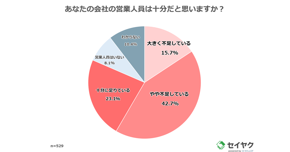 「あなたの会社の営業人員は十分だと思うか」と質問したところ、「大きく不足している(15.7%)」、「やや不足している(42.7%)」と58.4%が営業人員の不足を感じていることがわかった。