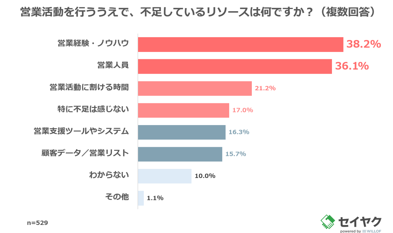 また、「営業活動を行ううえで不足しているリソースは何か(複数回答)」と質問したところ、「営業経験・ノウハウ(38.2%)」という回答が最多だった。次いで、「営業人員(36.1%)」、「営業活動に割ける時間(21.2%)」という結果となった。単に人手不足だけでなく、営業に関する経験や知見の蓄積が十分ではない、と感じている人が多いということがわかった。