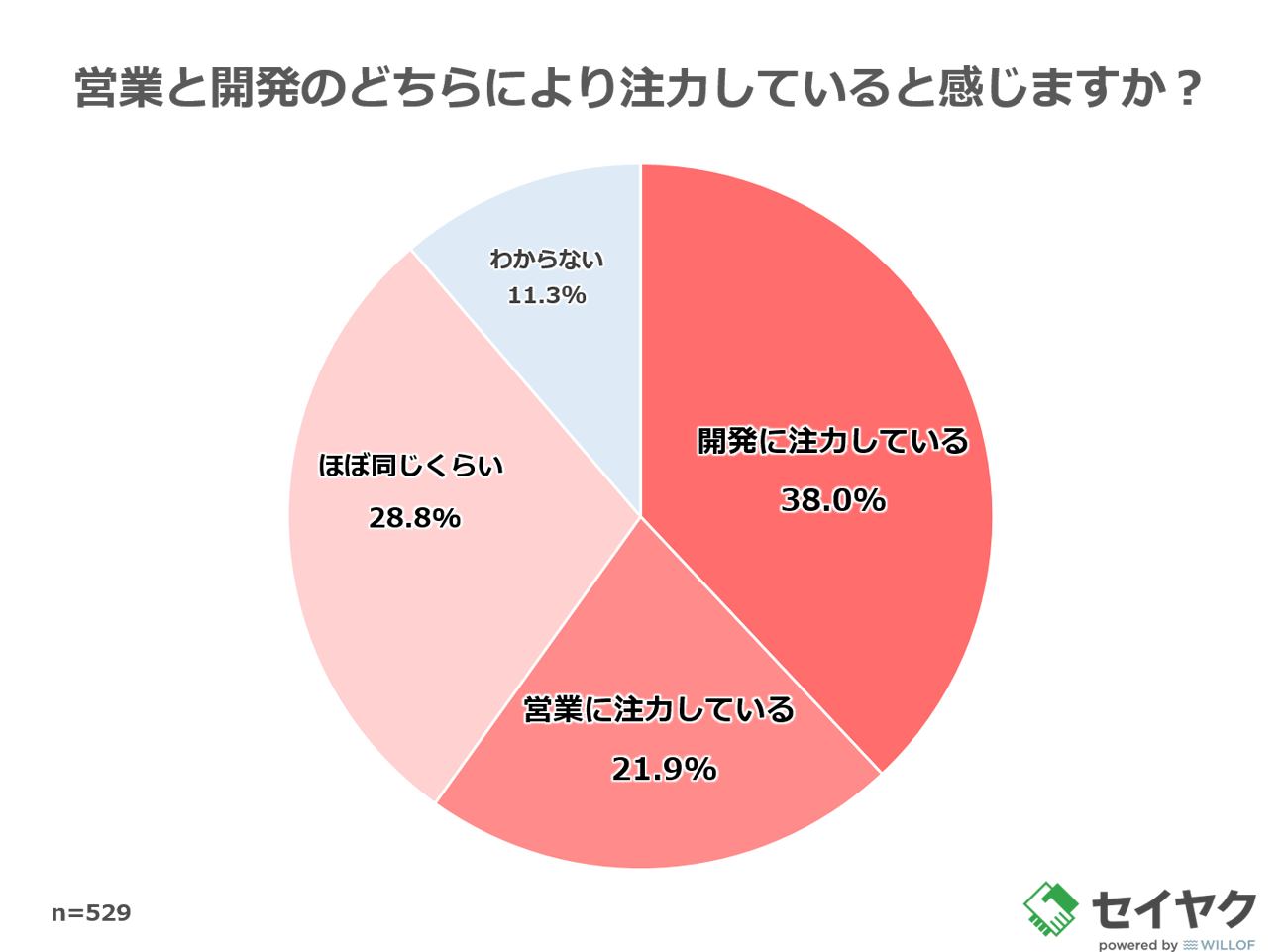 「あなたの会社では営業と開発のどちらにより注力していると感じるか」と質問したところ、「開発に注力している(38.0%)」、「営業に注力している(21.9%)」という結果になった。「ほぼ同じくらい」と回答した割合は28.8%で、両立を図っている企業も一定数見られますが、「開発に注力している」と感じる割合がやや多い結果だった。