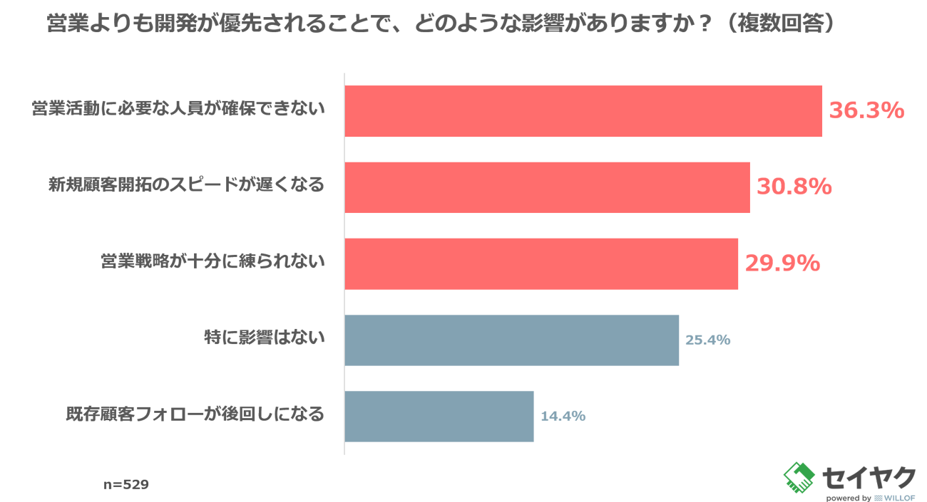 さらに、「開発が優先されている」と答えた人を対象に「営業よりも開発が優先されることでどんな影響があると思うか」と質問したところ、「営業活動に必要な人員が確保できない(36.3%)」が最も多い結果となった。次いで、「新規顧客開拓のスピードが遅くなる(30.8%)」、「営業戦略が十分に練られない(29.9%)」といった影響があることがわかった。