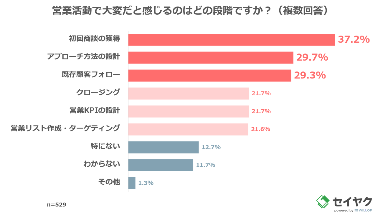 ウィルグループの総合人材サービスを手掛けるウィルオブ・ワークは、運営する営業代行サービス「セイヤク」にて、IT企業で働く20歳以上の男女529名を対象に、「営業課題に関するアンケート調査」を実施した。