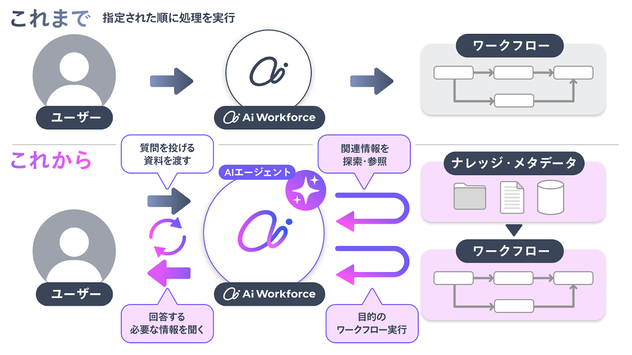新しい基盤では、AIエージェントとAIワークフローをカスタマイズして組み合わせることができる。AIエージェントはユーザーの要求を理解して必要なAIワークフローを呼び出し、AIワークフローは処理を実行する。
