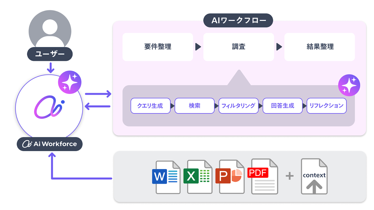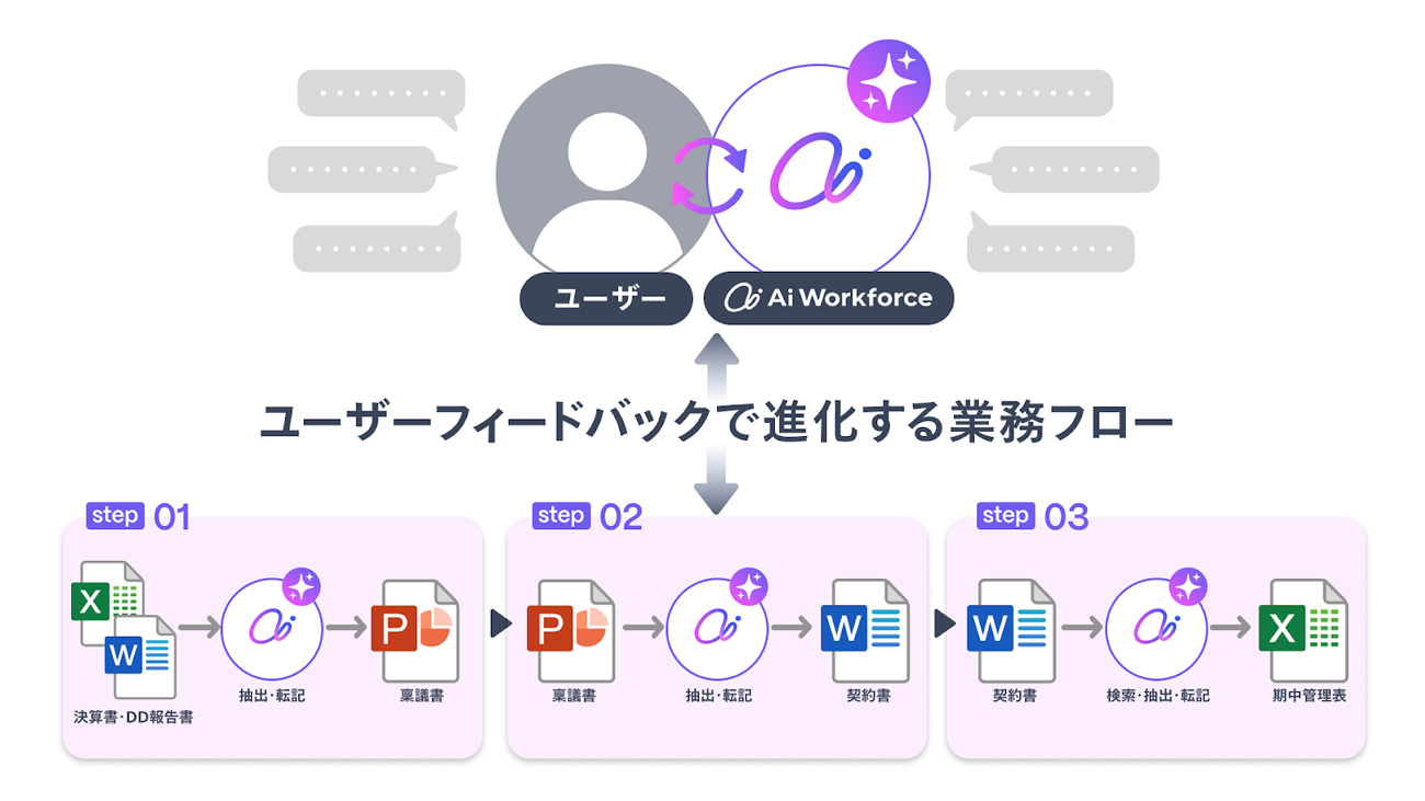 LayerXは、「企業と共に成長する」をコンセプトとしたAIプラットフォーム「Ai Workforce」を提供している。これまで、エンタープライズ企業を中心に、AIワークフロー機能を活用し、企業ごとに異なる業務プロセスをAIに教えることで、営業・法務・人事・研究開発といったさまざまな業務におけるドキュメントの管理・作成・レビューを支援してきた。