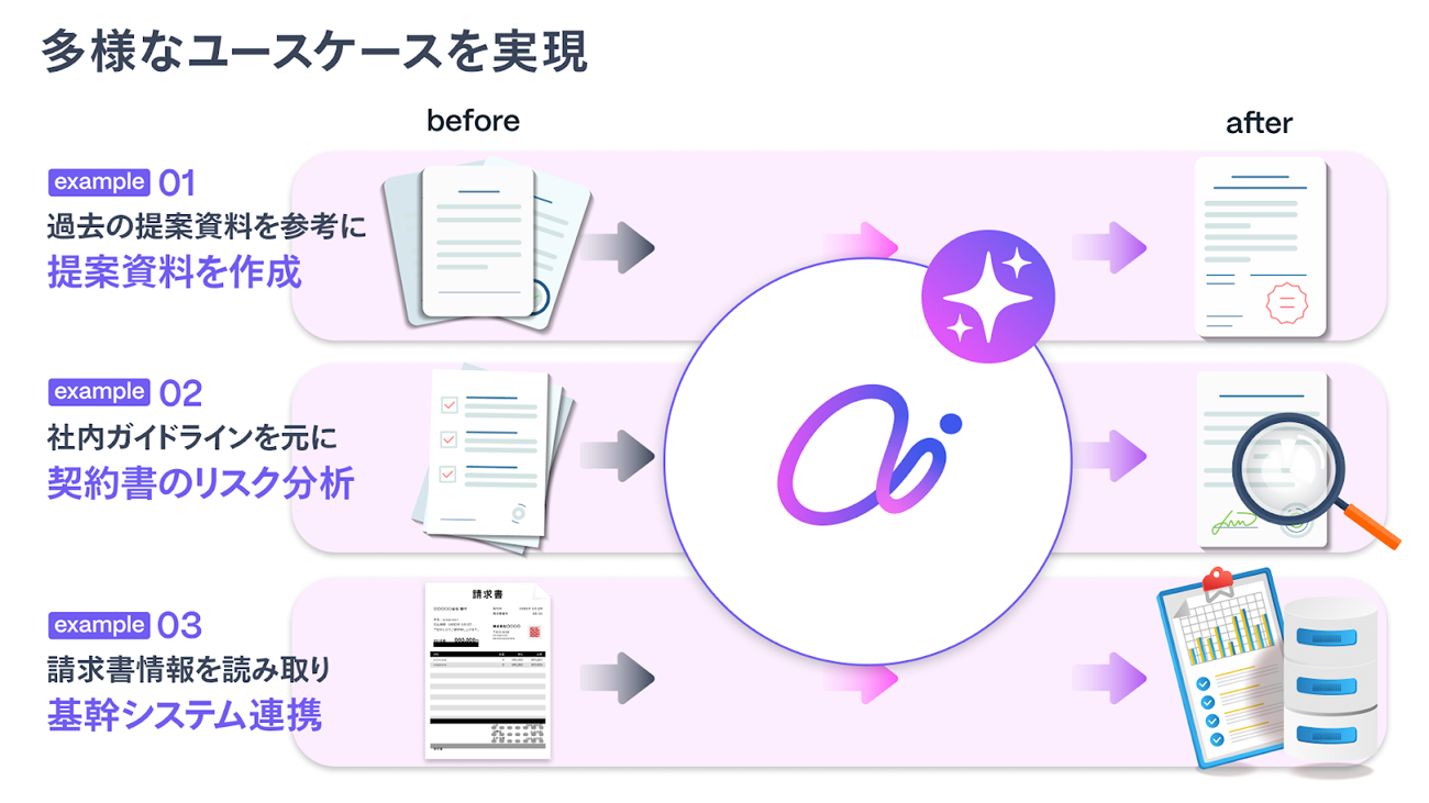 たとえば、過去提案資料を参考にして提案資料を作成、社内ルール・ガイドラインを元にした契約書のリスク分析、請求書から情報を読み取って基幹システムに連携、といった多様なユースケースの実現できる。