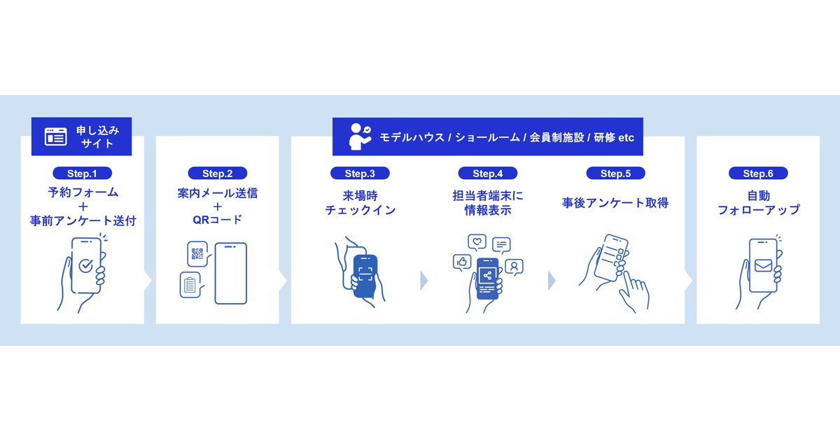 本サービスは、カスタマープラットフォーム「HubSpot」と、デジタルエクスペリエンスが開発したQRコードチェックインツールVisit Logを連携させて提供する。この連携により、オンラインでの来訪予約から、専用QRコードの発行、自動でのメール・アンケート送付、そして現地でのQRコードによる受付チェックイン、来訪時の接客対応記録、事後アンケートまでを、一気通貫で行う。