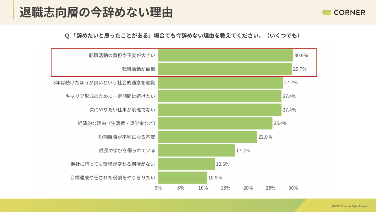 退職志向層に今辞めない理由を質問したところ、「転職活動への心理的・事務的な負担」と「次の選択肢の不明確さ」が理由の中心だということがわかった。また、「キャリア形成の不安」も一定数みられた。一方で、「成長・学び(17.1%)」「目標をやりきりたい(10.9%)」など、前向きな残留理由の回答は相対的に少なかった。