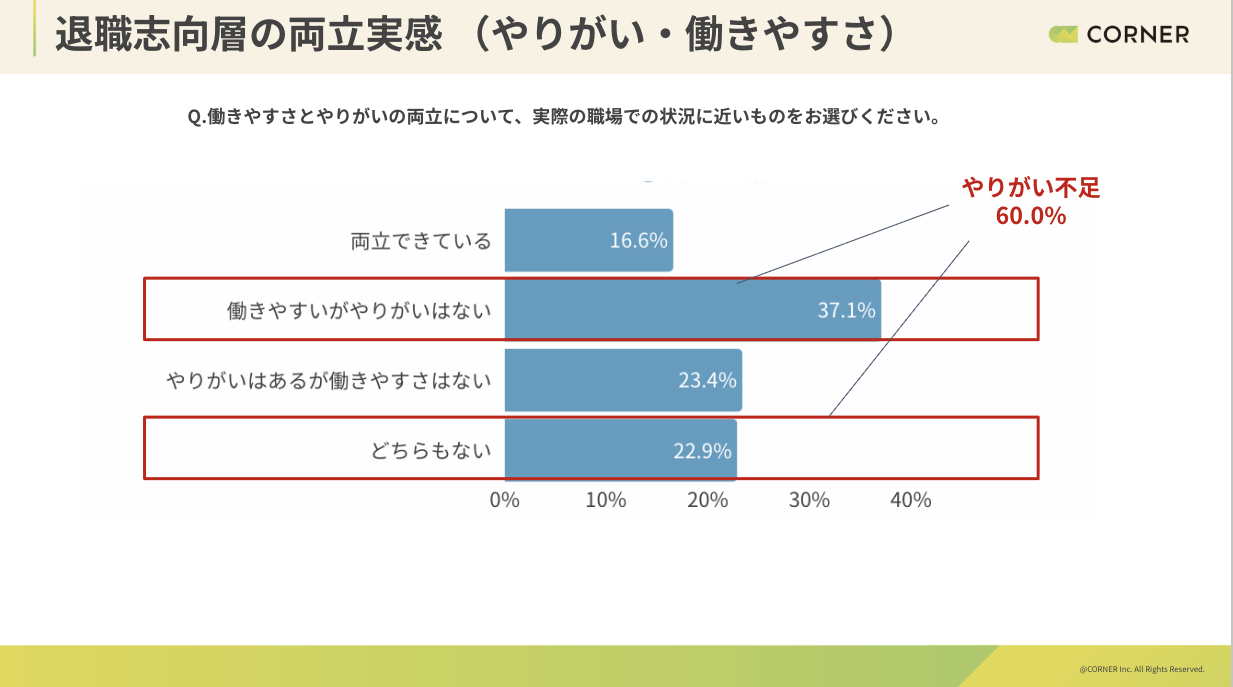 退職志向層の不満は処遇・昇進・裁量などやりがい側に偏っていたため、「働きやすさとやりがいの両立について、実際の職場での状況に近いものをお選びください」と、「働きやすさ」「やりがい」の両立実感を質問したところ、「両立できている」は16.6%にとどまった。一方、「働きやすいがやりがいはない」「どちらもない」が60.0%のため、やりがい不足が浮き彫りになった。