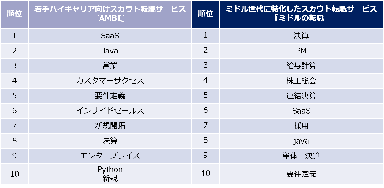エンは、若手ハイキャリア向けスカウト転職サービス「AMBI」と、ミドル世代に特化したスカウト転職サービス「ミドルの転職」上で、レジュメ(職務経歴書)を検索する際に使用したキーワードを集計した。また、各サービスの2023年から2025年の各年上半期のランキングトップ10についても発表した。