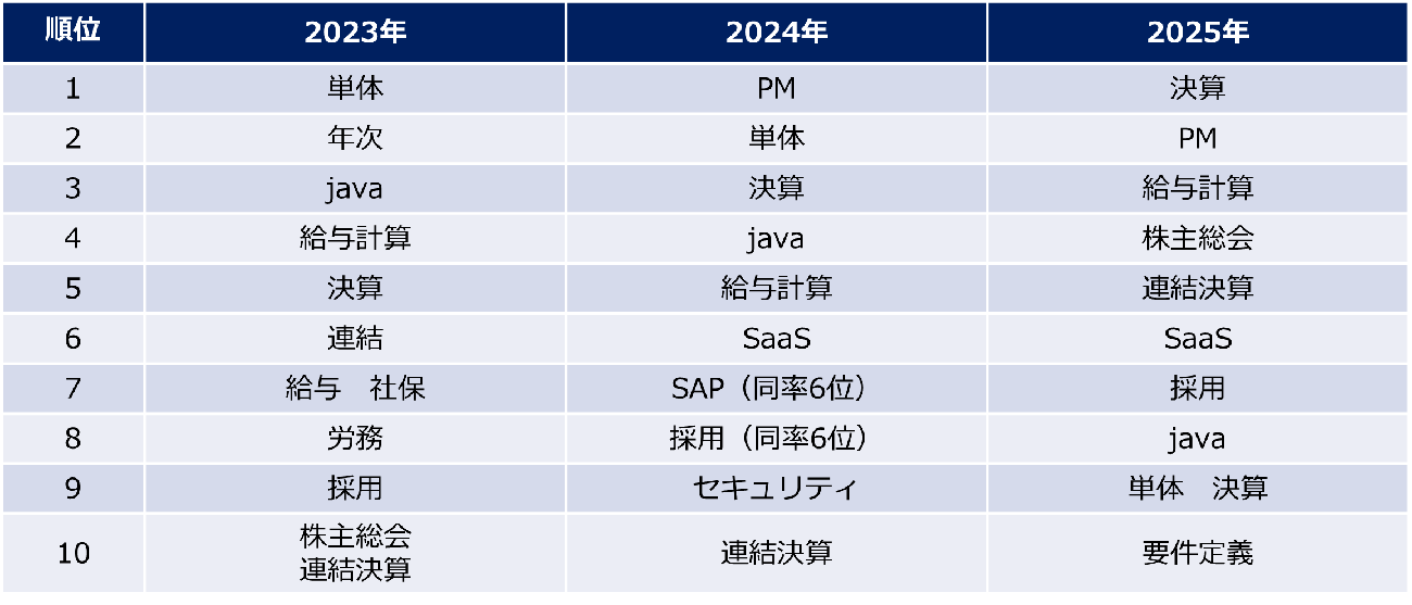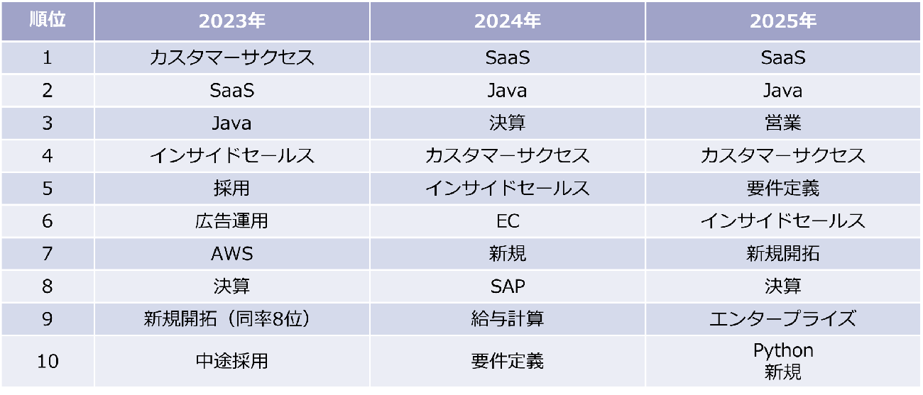 2023年までトップ10圏外だった「PM(プロジェクトマネージャー)」が、2024年以降急上昇した。その背景には、企業のDXフェーズが「導入」から「活用」へと移行したことが挙げられる。