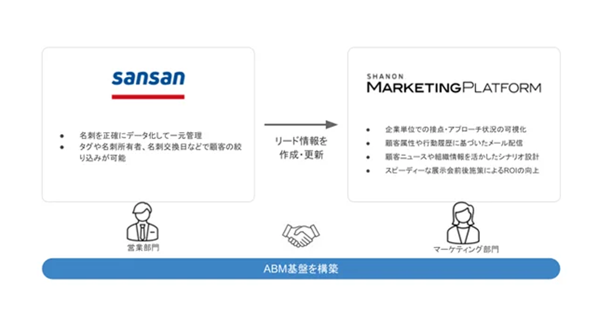 こうした背景により、名刺や企業情報、営業履歴を一元管理できるSansanと、顧客のさまざまな流入経路、接点、行動変化を逃さず、機会損失を防ぐシャノンMAの両社は、日本市場におけるABMのさらなる普及を推進するため、本連携に至った。