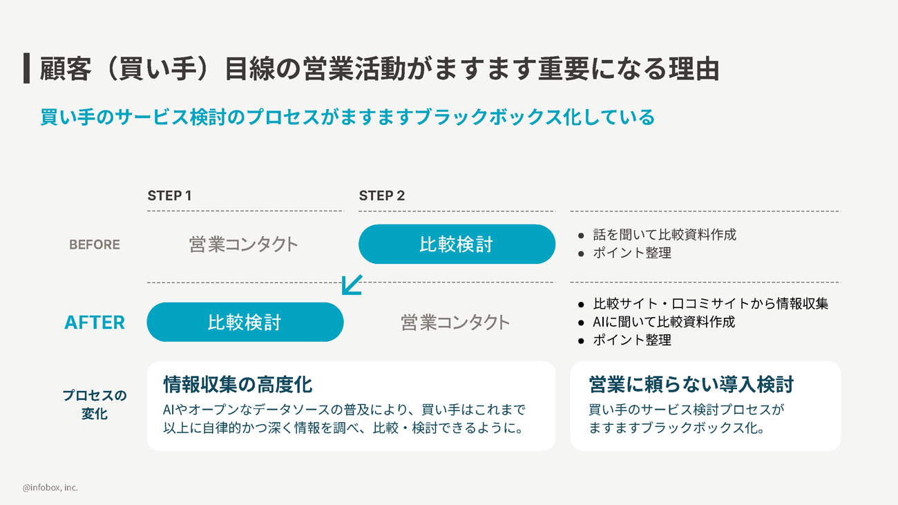 ここで内藤氏は、顧客の購買方法が時代とともに変化していることに言及。「営業から情報を集めて検討するという従来のプロセスから、自らインターネット上で検索し、AIに比較ポイント資料の作成を依頼するなど、営業に頼らない、もしくは営業へのコンタクトは最終段階、というものに変わってきている。つまり、買い手の購買検討プロセスがブラックボックス化している」と説明した。