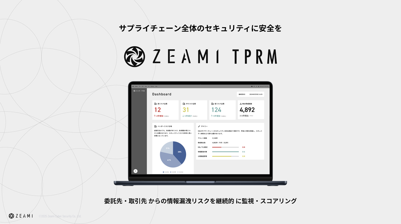 ZeamiCyberSecurityは、取引先や委託先に潜むサプライチェーンリスクを自動で可視化・評価する新サービス「Zeami TPRM(Third Party Risk Management)」β版の事前登録を開始した。