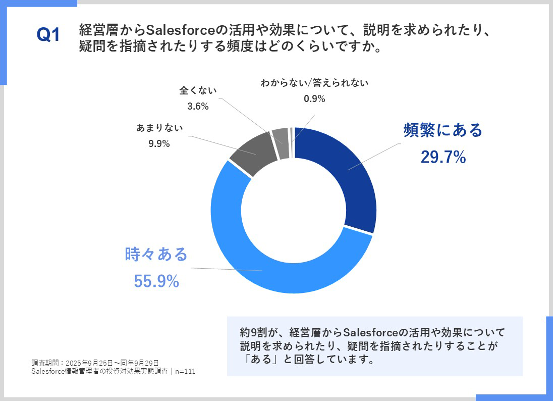 約9割が、経営層からSalesforceの活用や効果について説明を求められたり、疑問を指摘されたりすることが「ある」と回答した(頻繁にある29.7%/時々ある55.9%)。これにより、経営層からの説明責務は定常化し、定量根拠となる入力データの品質・鮮度の確保が管理者の最重要KPIになっていることがわかった。