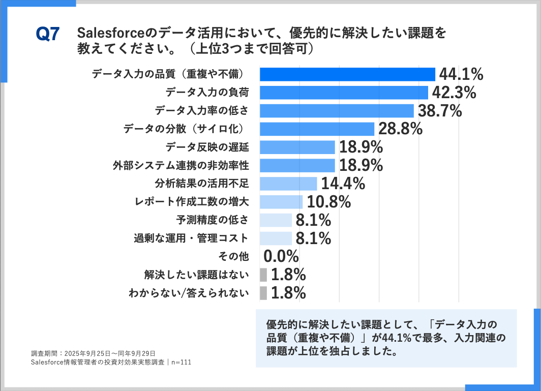 「データ入力の品質(重複や不備)」44.1%が最多の回答だった。続いて、「入力の負荷」42.3%、「入力率の低さ」38.7%という回答だった。品質・負荷・率という入力の三重課題がボトルネックだということがわかった。