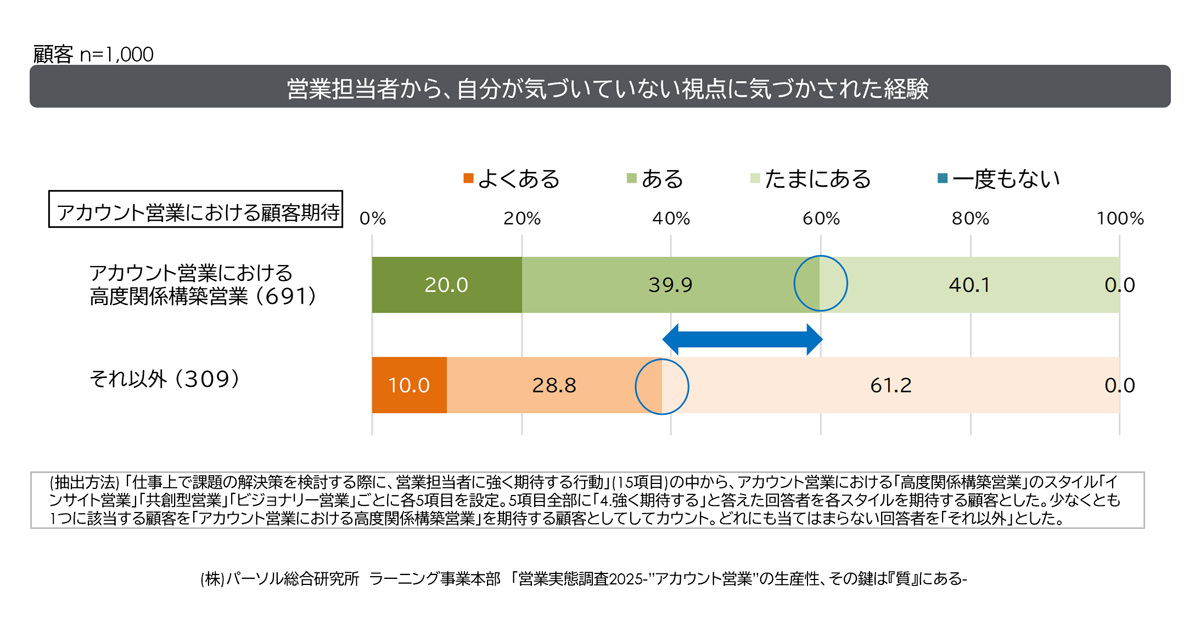 アカウント営業における「高度関係構築営業」を期待している顧客層では、営業担当者から示唆を受けた経験が「よくある」「ある」の合計が約6割を占め、「それ以外」より約2割多い。より高度な顧客期待に応えることができる営業担当者が多数存在していることが見て取れる。