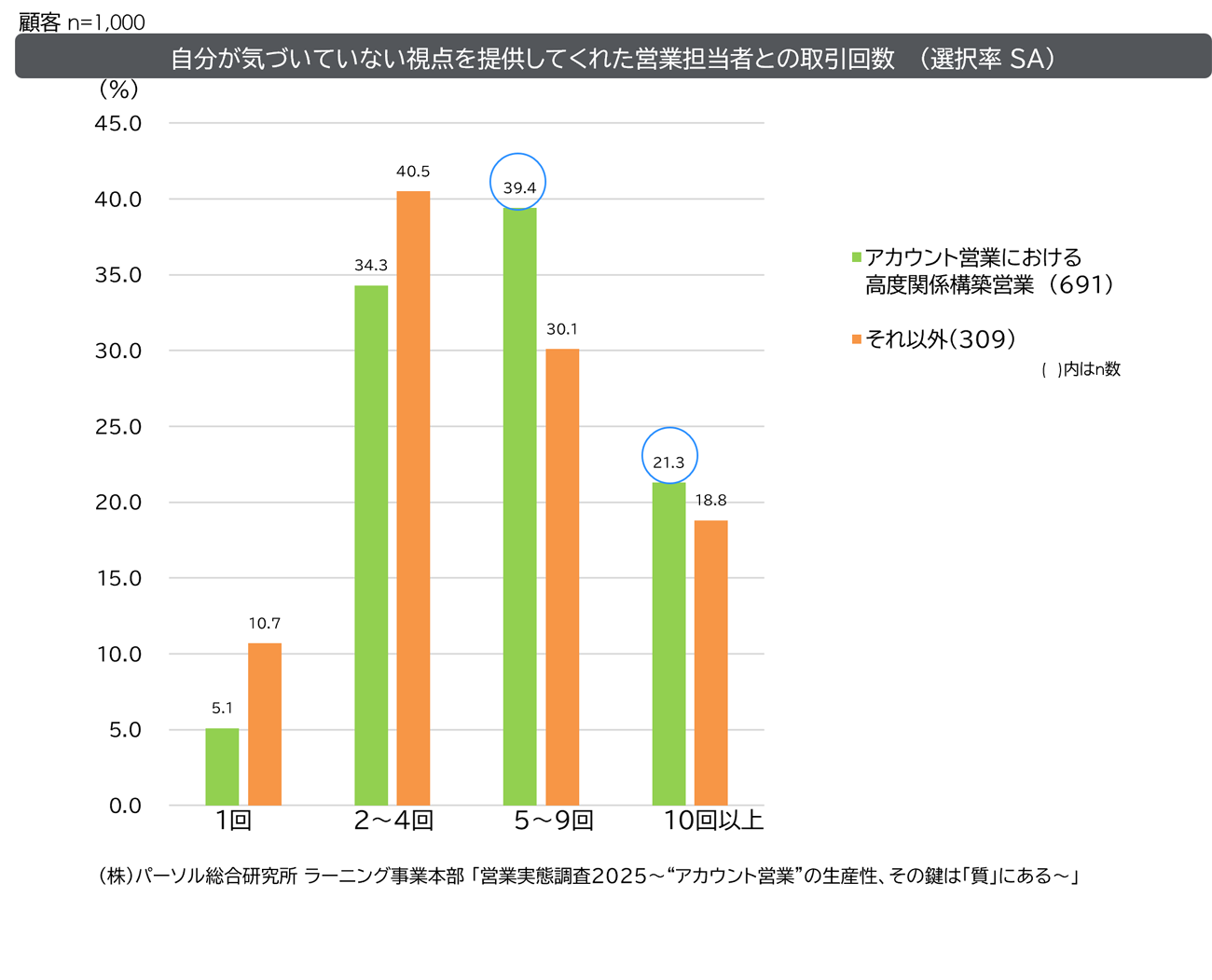 「高度関係構築営業」は、1回だけの取引は少なく、5回以上の取引継続が6割を占める。