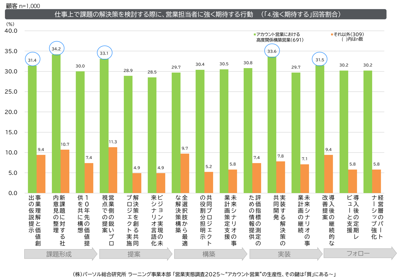 営業に期待される行動は、課題形成~提案段階では「鋭いプロ視点で解決策の提案」のために、「価値創出の仮説提示」「多様な社内意見の整理」が重視される。