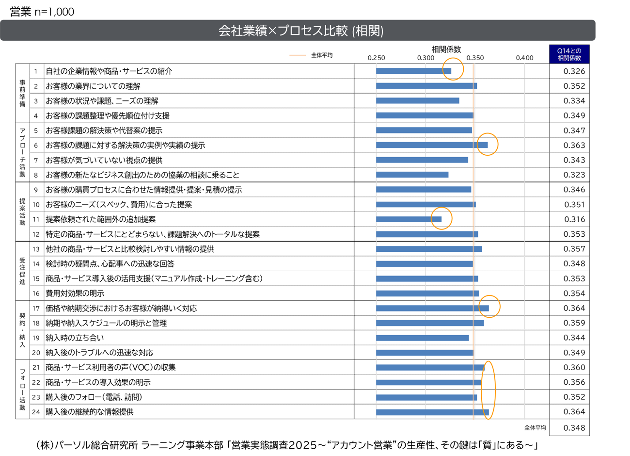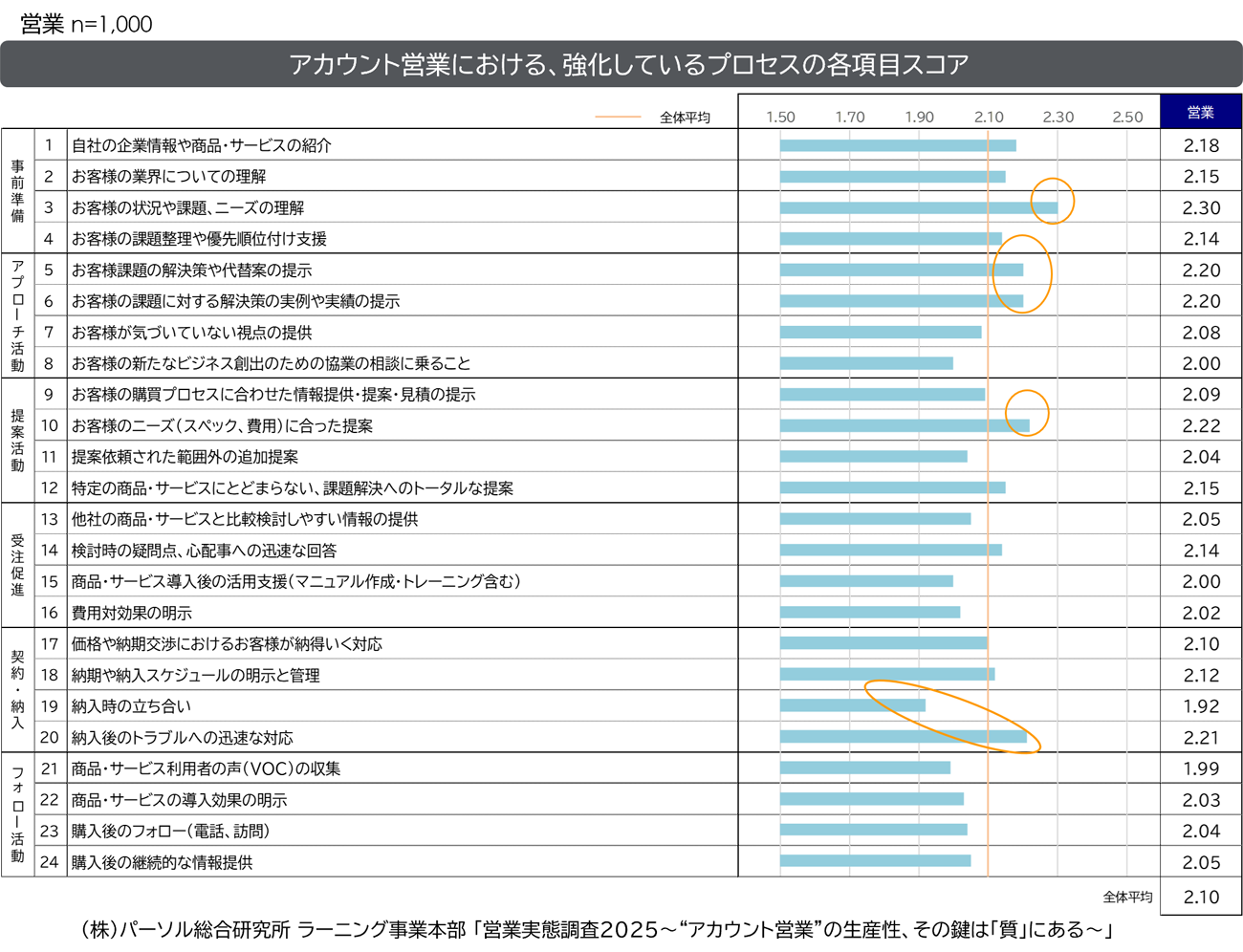 それに対して業績貢献度が比較的に高い割に強化度合いが低い項目として、「フォロー活動」の項目が並ぶ。とくに「商品・サービス利用者の声(VOC)の収集」や「購入後の継続的な情報提供」など、これは「やれば効果は出そう」だが、アカウント営業の特性上、一顧客あたりの取引数が多いため、実質的に対応が難しく、後回しになっている状況がうかがえる。とくに、「The Model」に代表される分業体制が進行していく中で、現行のカスタマーサクセス体制は、一顧客と深く関わるアカウント営業においては十分にその役割を果たしているとはいえず、営業担当を含めた新たな顧客対応体制の構築が必要と考えられる。