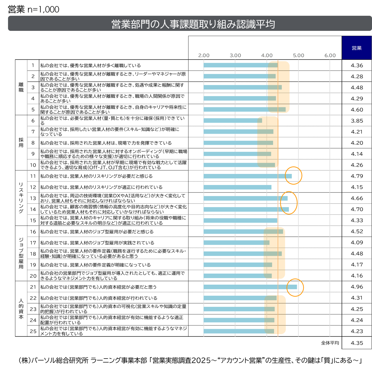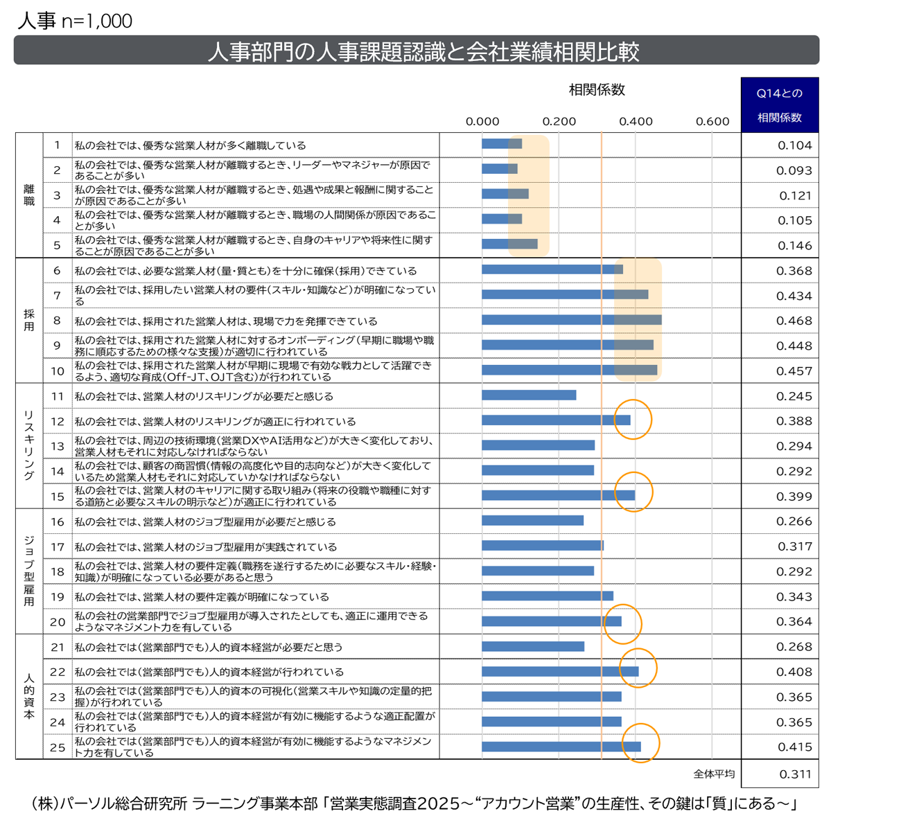 昨今の人手不足を反映して、「離職」や「採用」に関する課題認識が強く、営業(現場)と人事との間では切実感に開きがある(営業現場の方が切実に人材不足を感じている)。一方、これらの項目は業績との関連性(相関)も認められるため、「離職」を減らし、潤沢に「採用」することが事業課題に影響を与える重要な課題といえる。