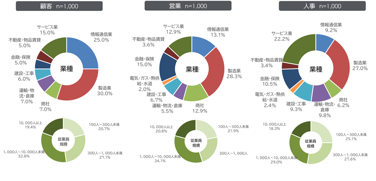 法人で100万円以上の購買をする顧客1,000名を対象に、アカウント営業への「顧客期待」を調査した。とくに、大手企業が営業担当者に期待する営業行動を次の3タイプ各5項目で設定した。各5項目すべてに「強く期待する」と答えた顧客を各タイプを期待する層とし、少なくともひとつのタイプへの期待がある場合に、「アカウント営業における『高度関係構築営業』を期待する顧客」として、それ以外の顧客と比較した。