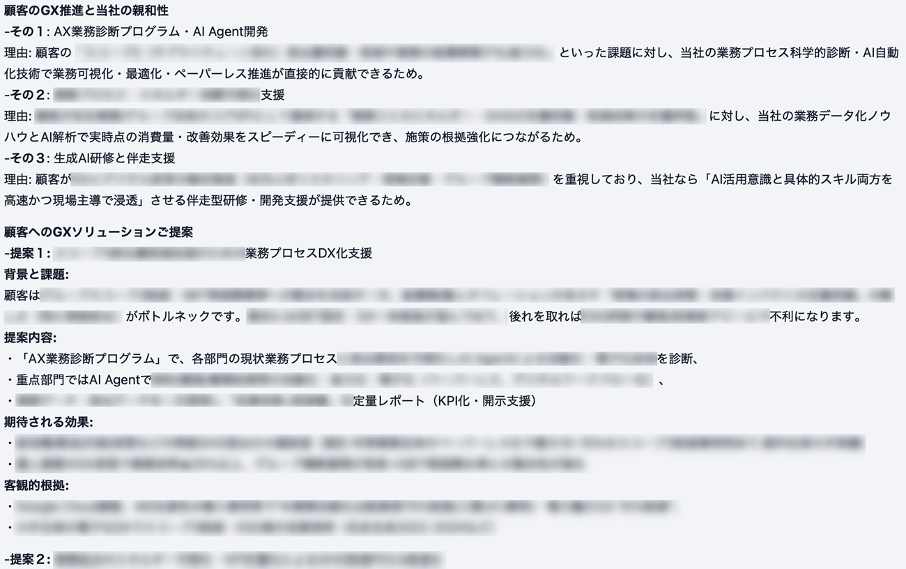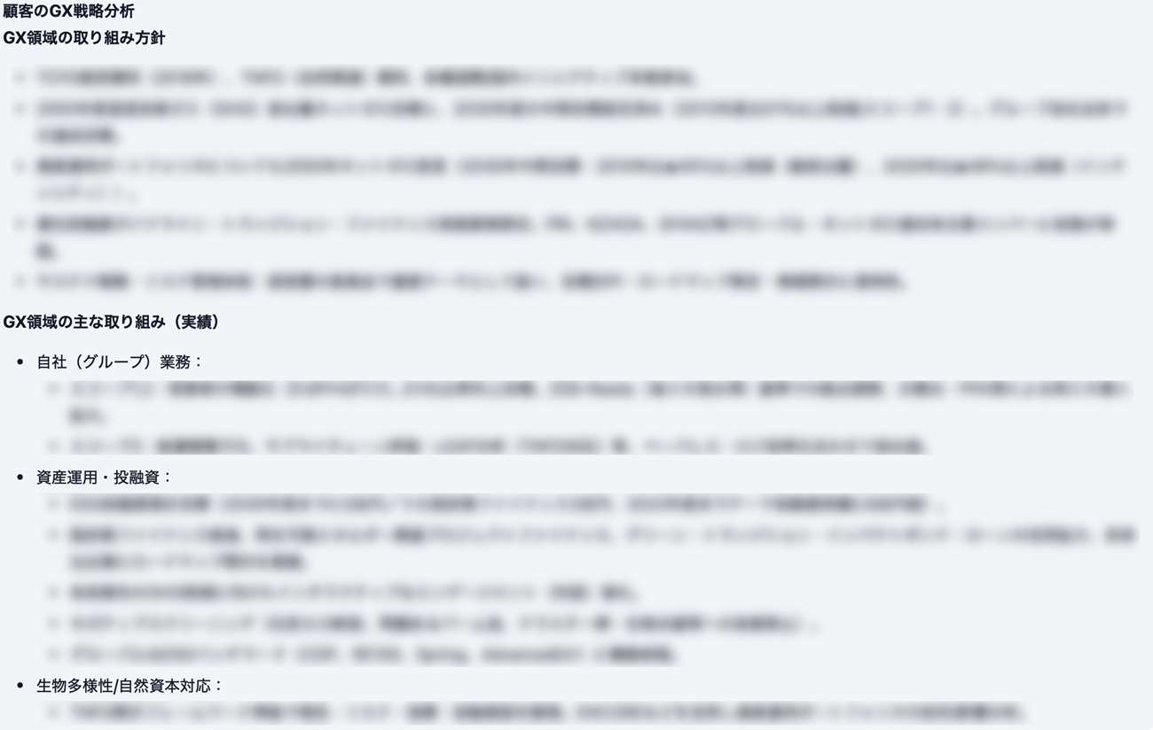 GX(グリーン・トランスフォーメーション)特化型AI:GX領域の営業に特化したデモ開発が完了している。たとえば、GX関連の特定情報ソース(例:関連省庁のドキュメント、業界レポート)を優先的に読み込ませ、GXの文脈に沿った課題特定とソリューション提案を自動生成させるといった、専門性のあるカスタマイズが可能。