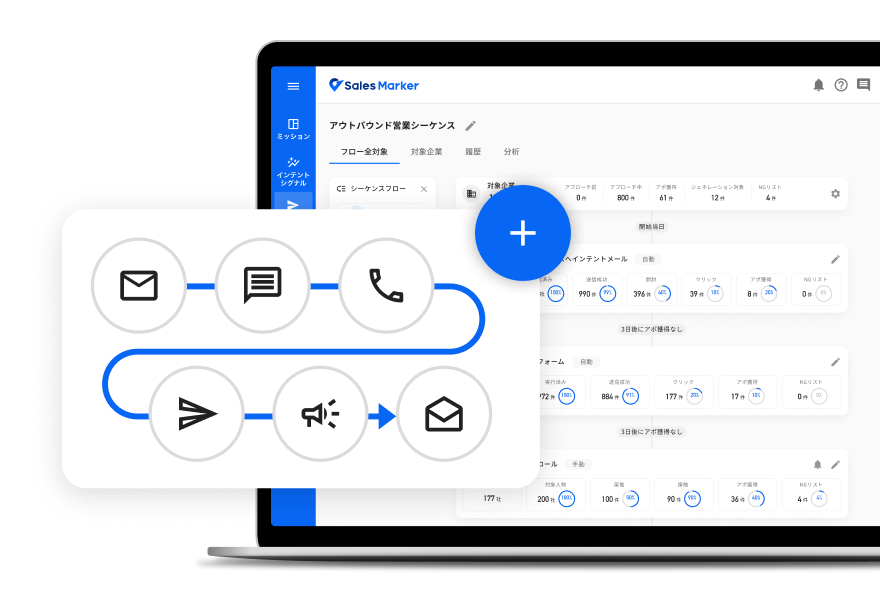 メール・コール・SNS・広告などSales Markerに実装された複数のチャネルを自由に組み合わせ、順番やタイミング(日数やアクション指定)の設定が可能。また、ターゲットや商材ごとに最適なアプローチを構築でき、再現性のあるシナリオ運用をを実現する。