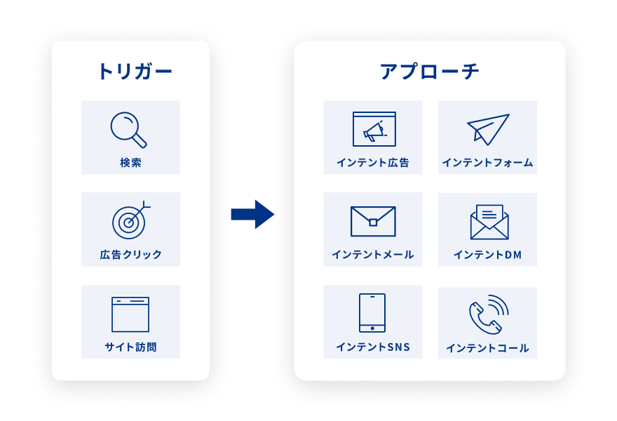 従来の検索インテントに加え、資金調達、広告クリック、自社HPや外部サイト訪問など、複数のインテントデータをトリガーにアクションを自動起動する。