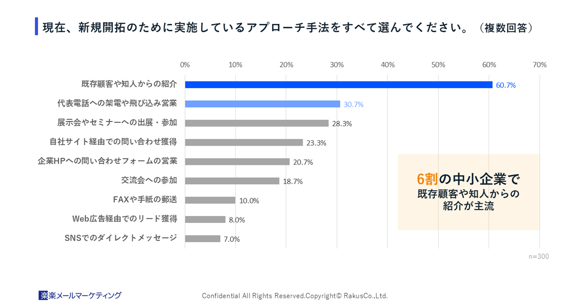 新規開拓のために実施しているアプローチ手法として、「既存顧客や知人からの紹介」が60.7%、次いで、「代表電話への架電や飛び込み営業」(30.7%)という回答となった。