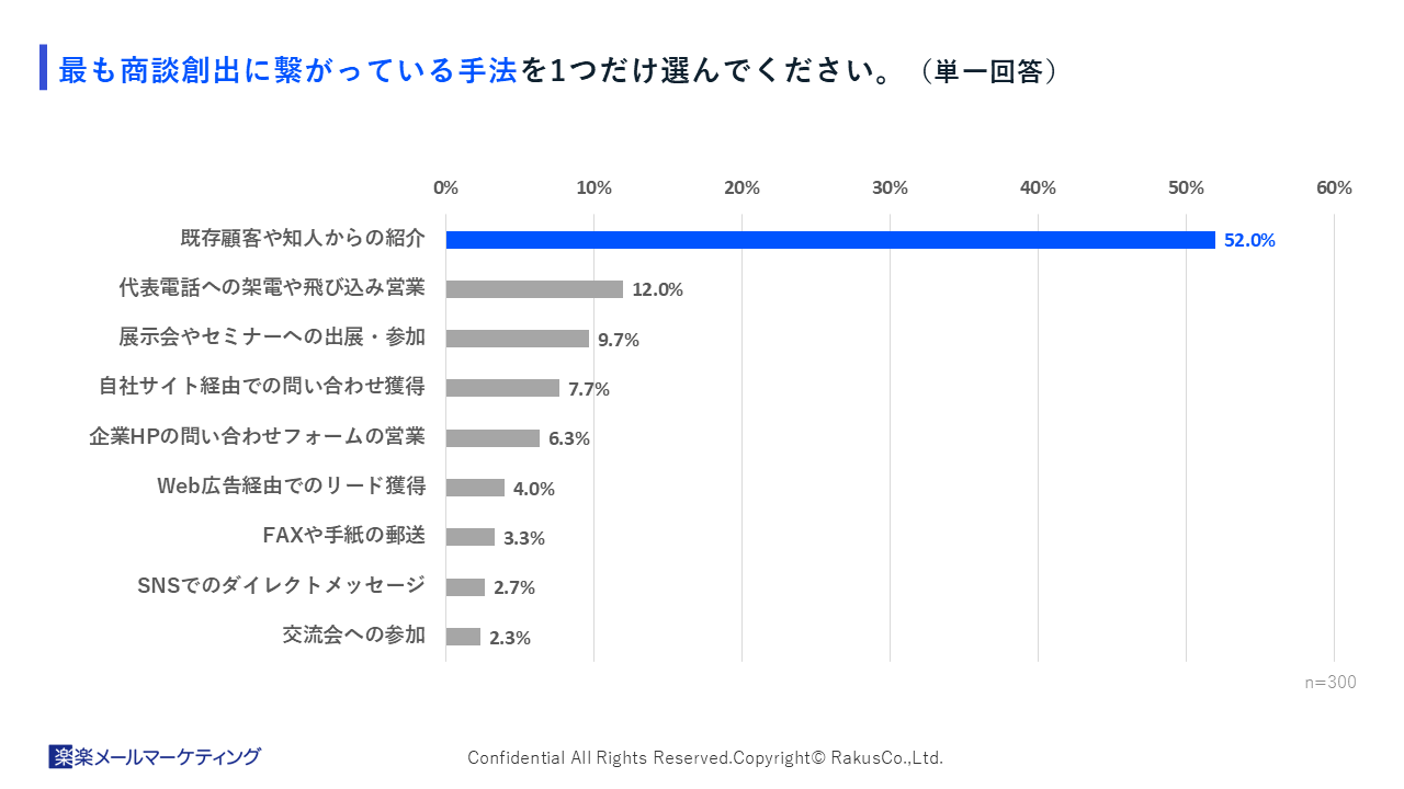 また、最も商談創出につながっている手法に限定すると、「紹介」は52.0%と半数以上を占める一方で、ほかの手法はいずれも12%以下にとどまった。