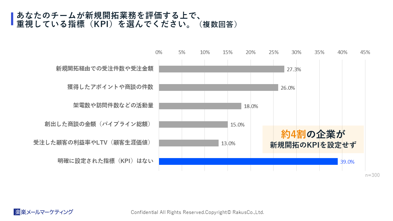 新規開拓業務を評価する指標(KPI)について、全体では39.0%が「明確に設定された指標(KPI)はない」と回答した。成果につながる活動を定量的に判断する基準を持たずに、日々の営業が行われているケースが少なくなかった。
